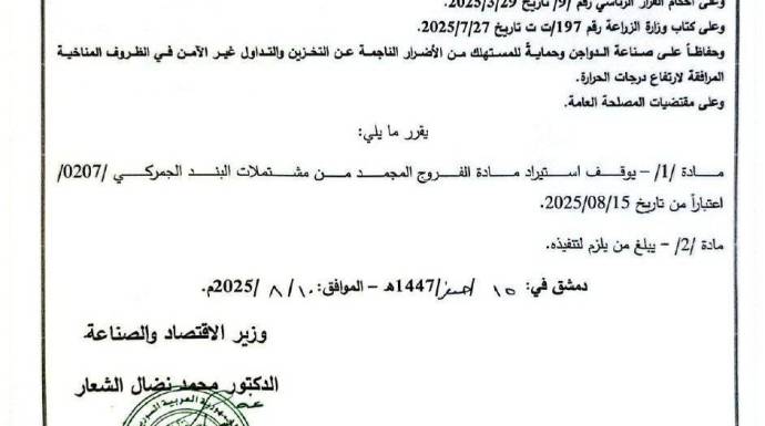 أصدرت وزارة الاقتصاد والصناعة السورية، اليوم الأحد، قراراً يقضي بوقف استيراد مادة الفروج المجمد اعتباراً من 15/8/2025.