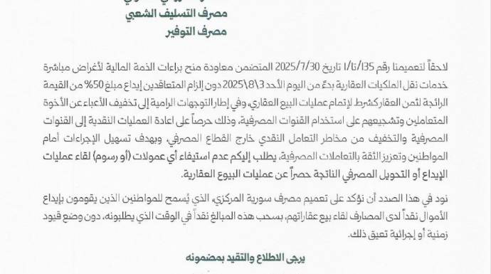 وتساءلت: "كيف يُطلب عدم استيفاء عمولات البيوع العقارية من المصارف العامة دون المصارف الخاصة، أليست المصارف الخاصة جزء من النظام المصرفي في سوريا؟".