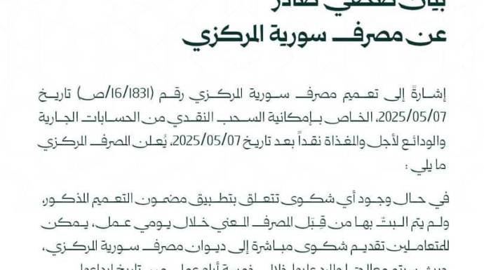دعا مصرف سوريا المركزي، المتعاملين مع القطاع المصرفي المحلي، ممن واجهوا أي مشكلات تتعلق بتطبيق تعميمه الخاص بإمكانية السحب النقدي من الحسابات الجارية والودائع لأجل، والمغذاة نقداً بعد تاريخ 7 أيار الفائت، بتقديم شكوى رسمية لديه.