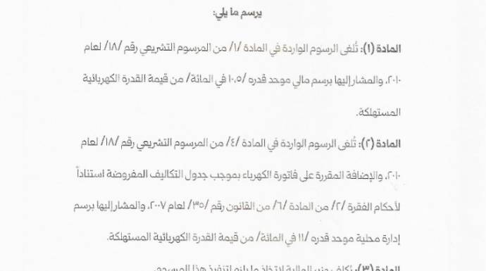 مرسوم بإعفاء فواتير الكهرباء من الرسوم المالية والإدارية