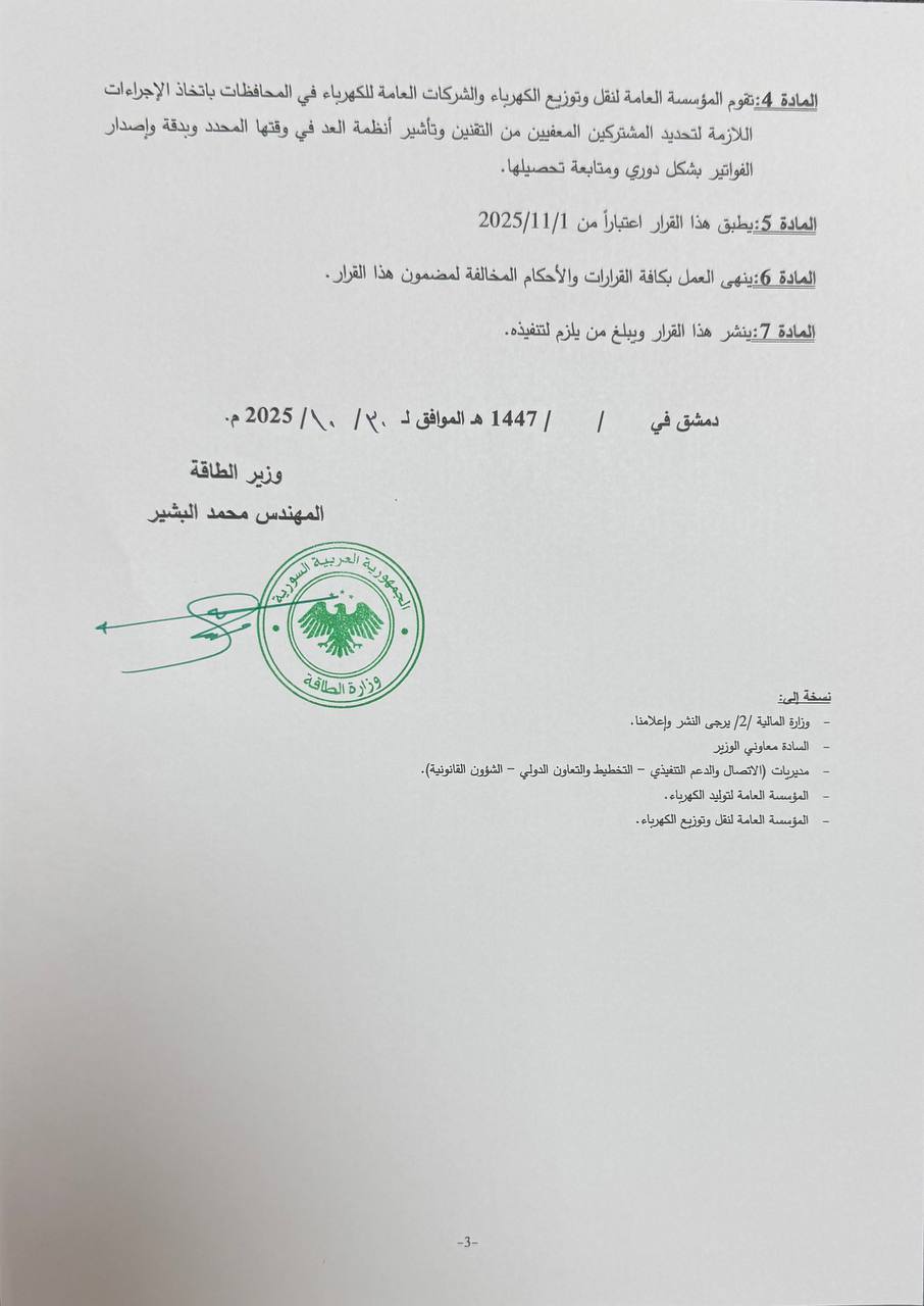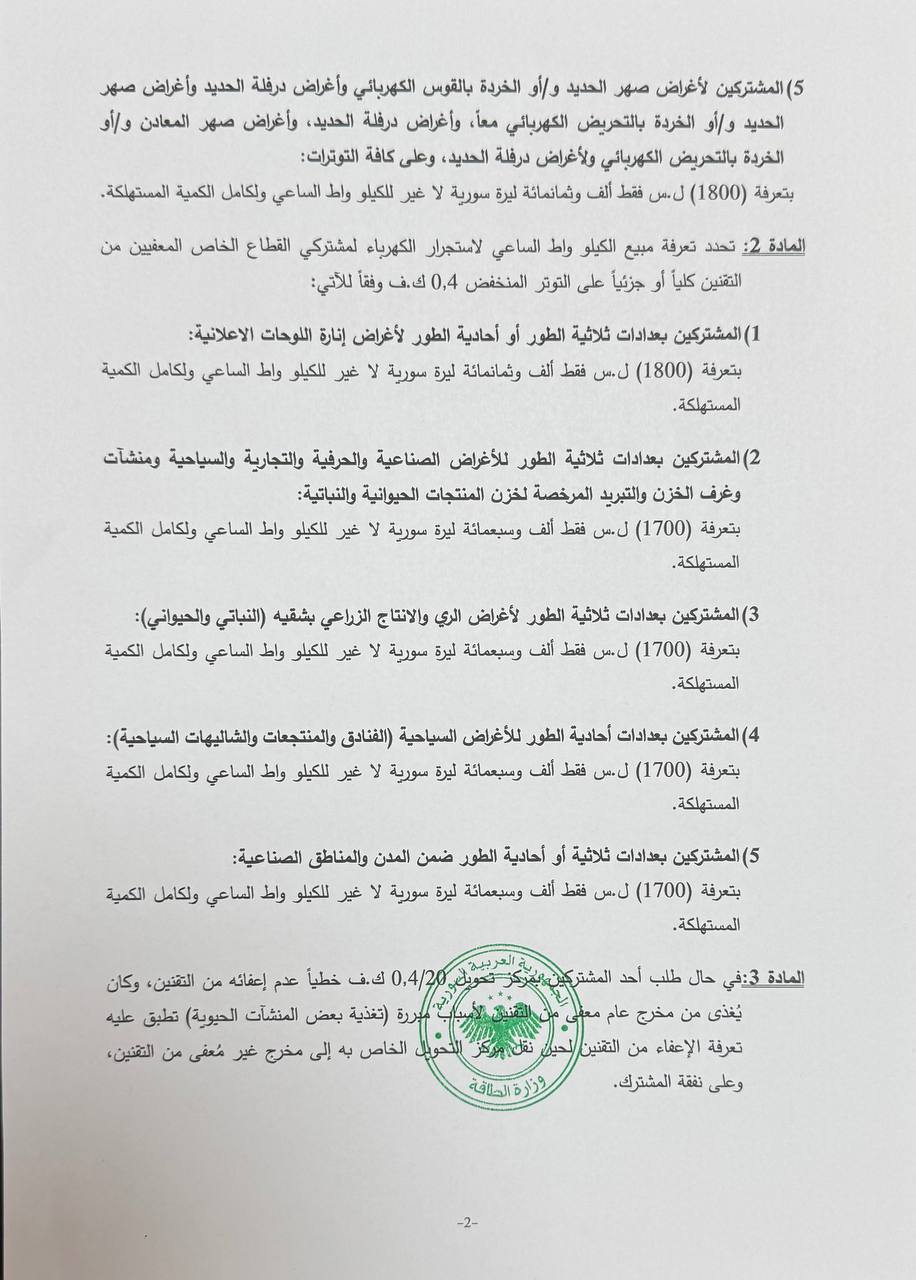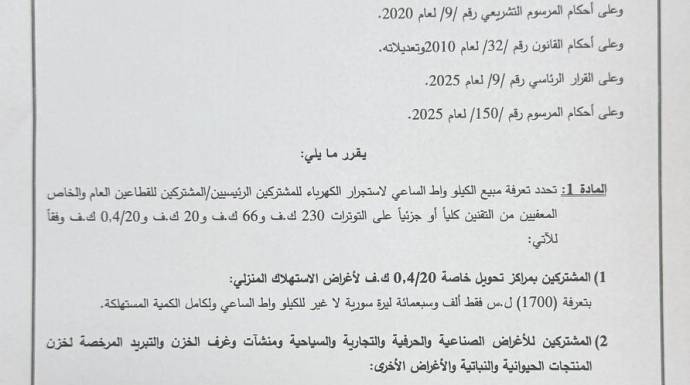 أصدرت وزارة الطاقة، اليوم الخميس، قراراً يقضي بتحديد تعرفة جديدة لمبيع الكيلو واط الساعي، لاستجرار الكهرباء للمشتركين الرئيسيين في القطاعين العام والخاص المُعفيين من التقنين كلياً أو جزئياً.