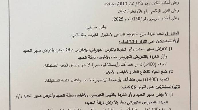 فيما حددت سعر الكيلو واط الساعي بـ 1400 ليرة، لمعظم الأغراض غير الاستهلاك المنزلي.