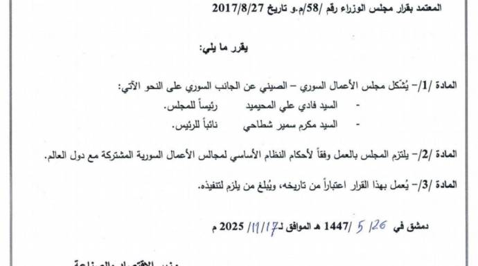 وفي خبر نشرته وكالة الأنباء السورية الرسمية "سانا"، تم تعيين فادي علي المحيميد رئيساً للمجلس، ومكرم سمير شطاحي نائباً له. وبحسب القرار، يلتزم المجلس بالعمل وفقاً لأحكام النظام الأساسي لمجالس الأعمال السورية المشتركة مع دول العالم، ويُعمل بهذا القرار اعتباراً من تاريخه، ويبلغ من يلزم لتنفيذه.
