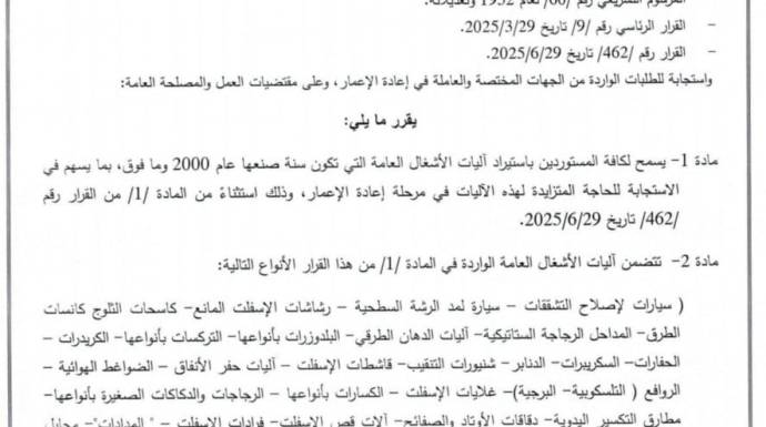 أصدرت وزارة الاقتصاد والصناعة قراراً يسمح لكافة المستوردين باستيراد آليات الأشغال العامة التي يعود تاريخ صنعها إلى عام 2000 وما بعد.