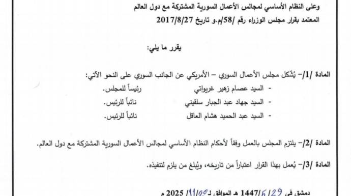أصدرت وزارة الاقتصاد والصناعة قرارين نصا على تشكيل مجلسين للأعمال، الأول، مجلس الأعمال السوري – الأمريكي، وعيّنت في رئاسته، عصام زهير غريواتي. فيما الثاني، مجلس الأعمال السوري – الفرنسي، وعيّنت في رئاسته، جمال الدين محمد ظافر القاسمي.