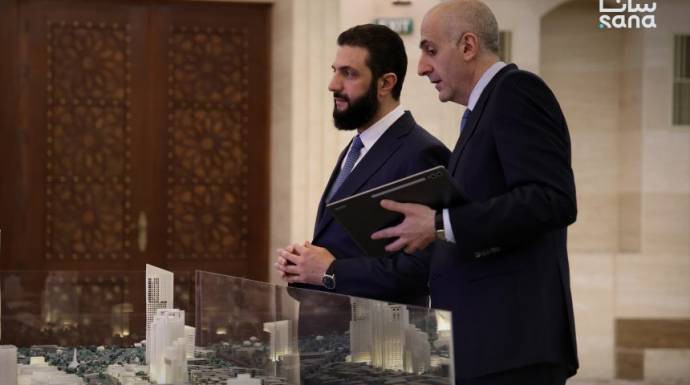 نشرت وكالة الأنباء السورية الرسمية "سانا"، صوراً تظهر الرئيس أحمد الشرع خلال إطلاعه على مشاريع للتطوير العقاري في مركز مدينة دمشق.