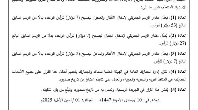 وينص القرار على تخفيض مقدار الرسم الجمركي لإدخال الأبقار والعجول من 53 دولاراً للرأس الواحد، ليصبح بـ 7 دولار.