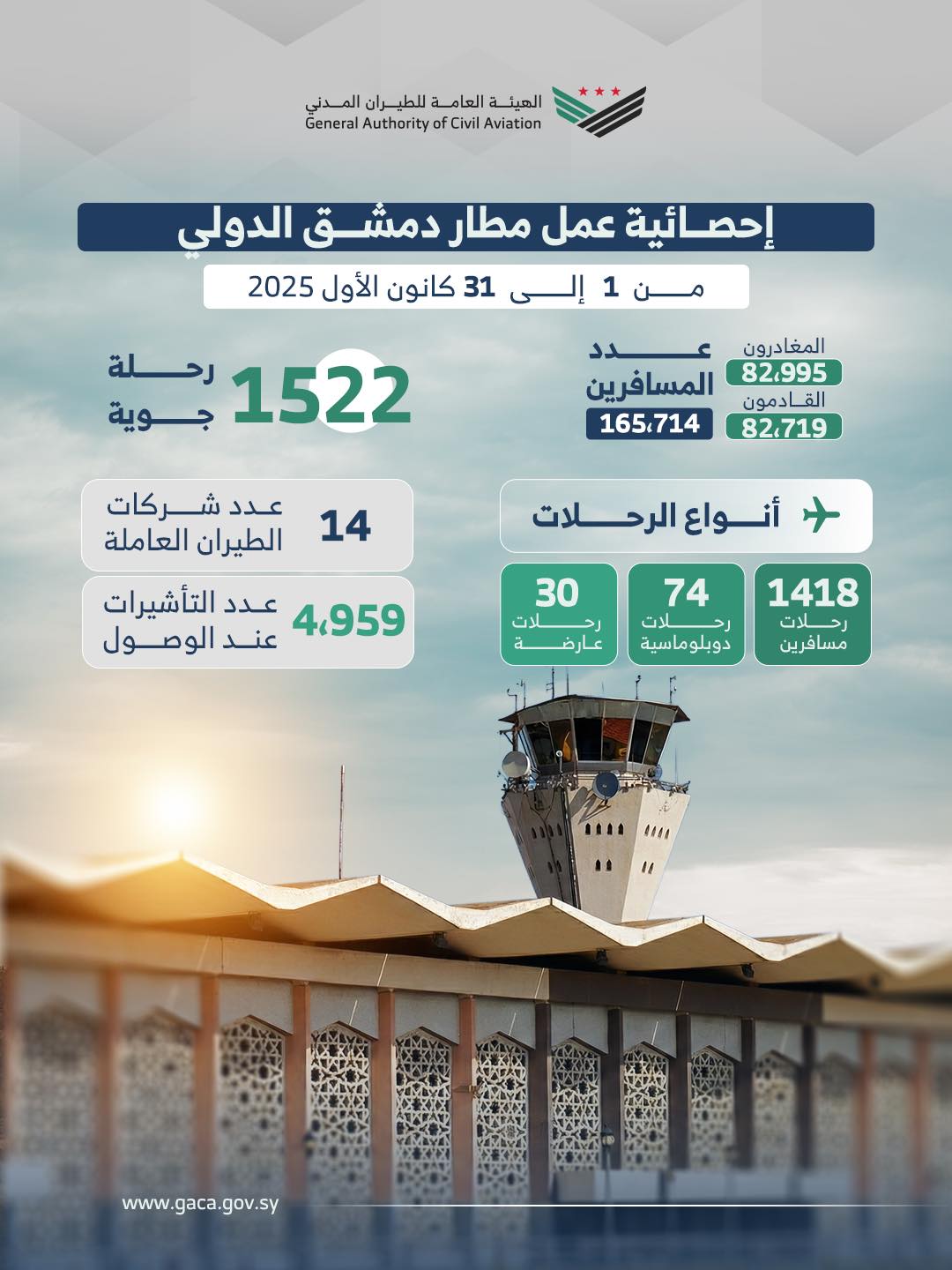 إحصائية لعمل مطار دمشق الدولي خلال كانون الأول 2025