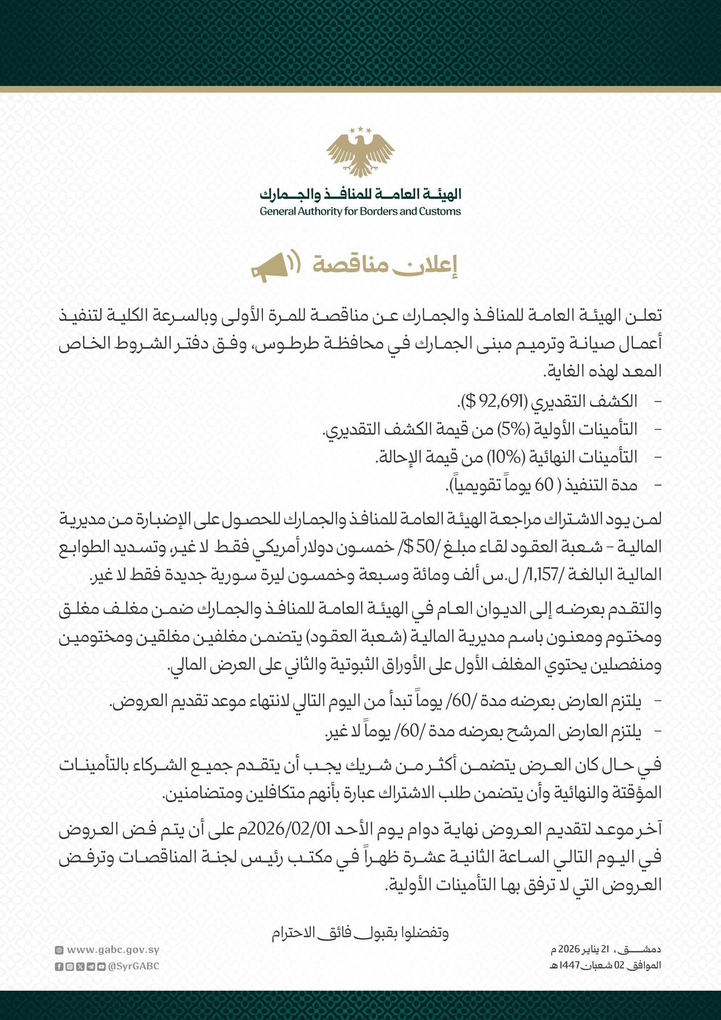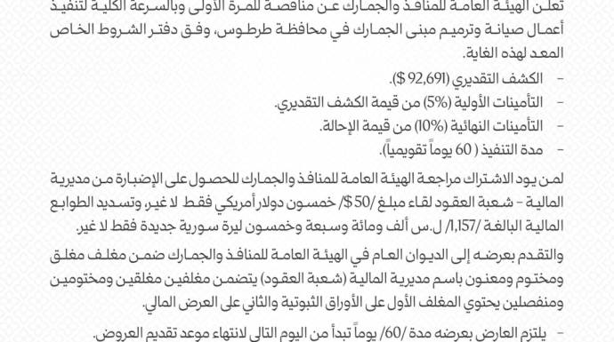 أعلنت الهيئة العامة للمنافذ والجمارك عن مناقصة للمرة الأولى وبالسرعة الكلية لتنفيذ أعمال صيانة وترميم مبنى الجمارك في محافظة طرطوس، وفق دفتر الشروط الخاص المعد لهذه الغاية.
