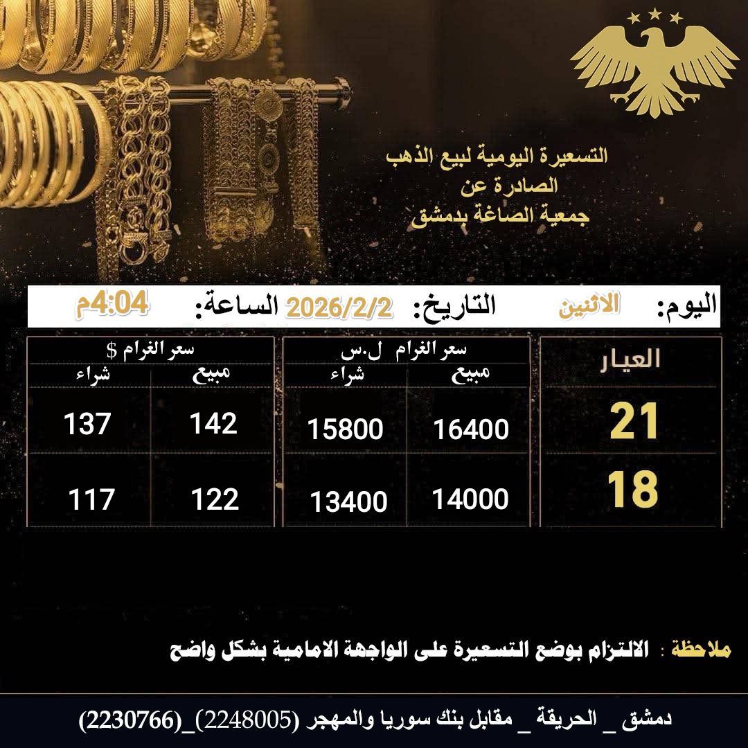 أصدرت جمعية الصاغة في دمشق، تسعيرة جديدة، هي الثالثة، حتى عصر اليوم الاثنين.