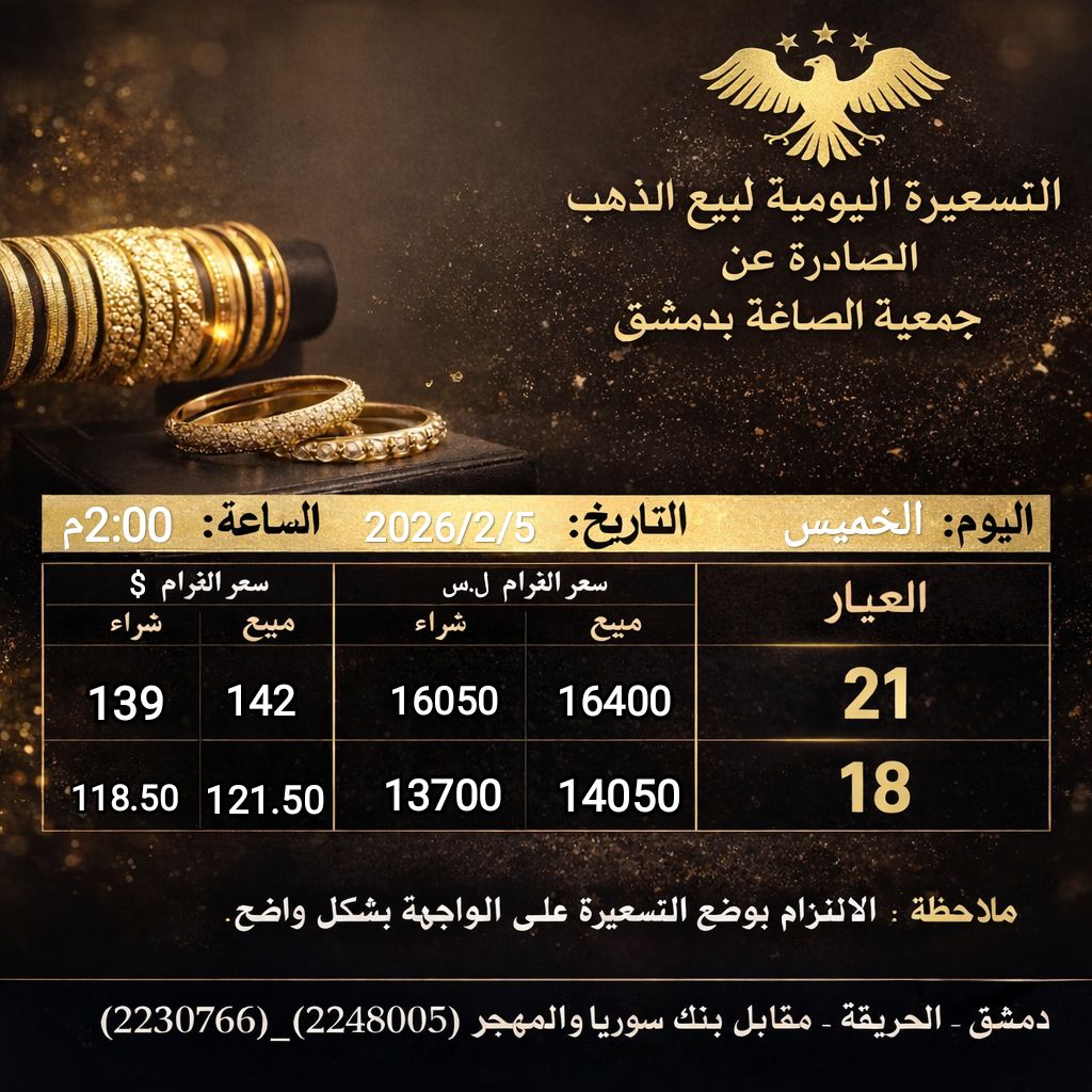 أصدرت جمعية الصاغة في دمشق، تسعيرة جديدة، هي الثانية، حتى عصر اليوم الخميس.