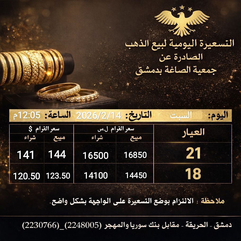 أبقت جمعية الصاغة في دمشق، تسعيرة الذهب الرسمية، مستقرة، دون تغيير، كما كانت في نشرتها السابقة الصادرة ظهيرة الخميس.
