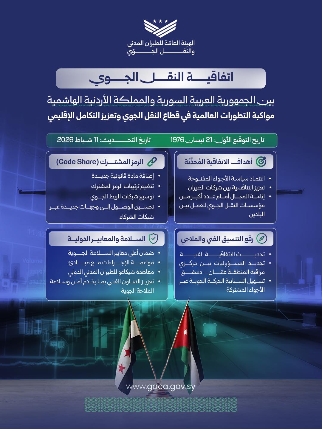 نشرت الهيئة العامة للطيران المدني السوري، "انفوغرافيك"، عرضت فيه تفاصيل الاتفاقية المحدّثة للنقل الجوي بين سوريا والأردن، والموقّعة في 11 شباط الجاري.