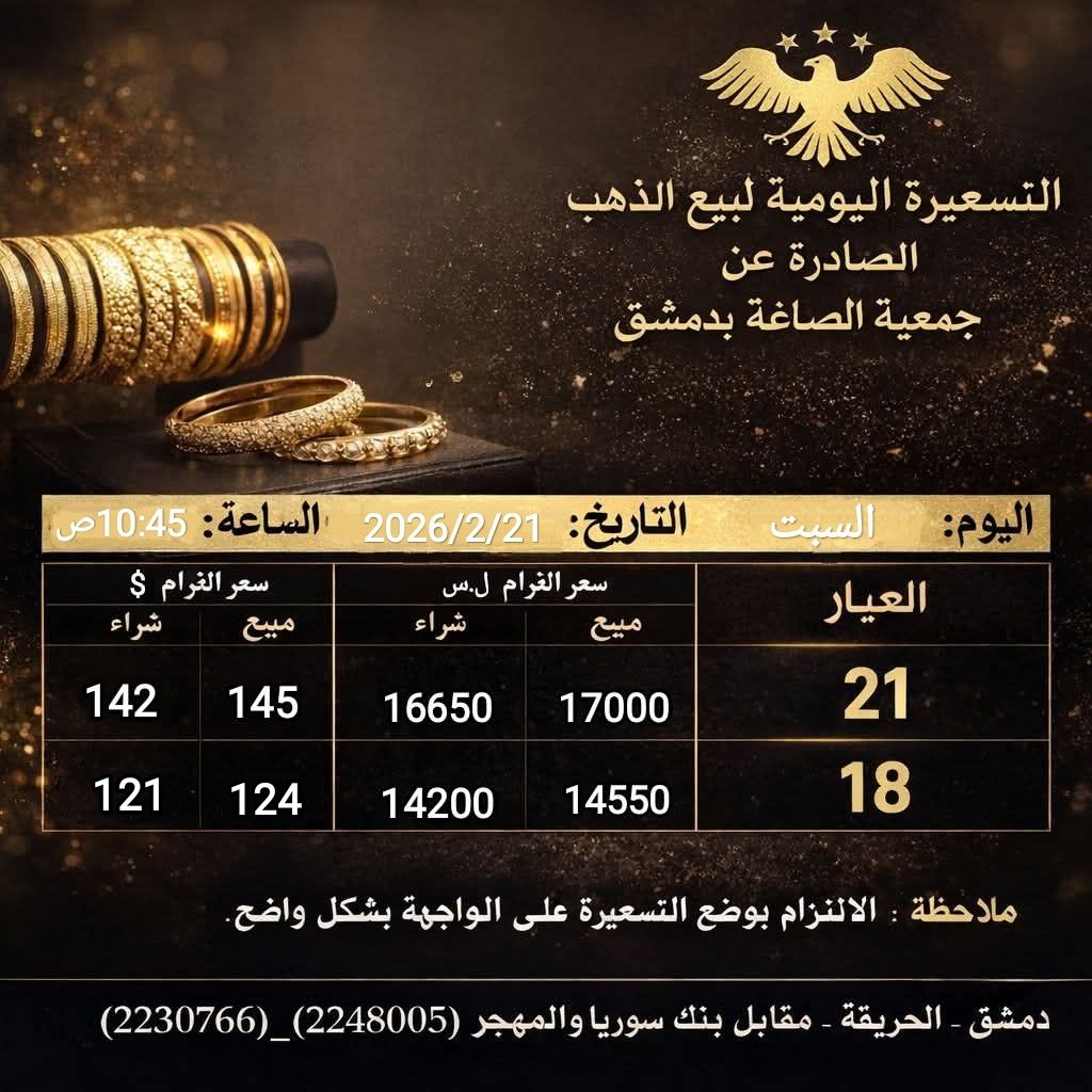 رفعت جمعية الصاغة في دمشق، السعر الرسمي للذهب، بصورة ملحوظة، وذلك في آخر تسعيرة صادرة عنها.