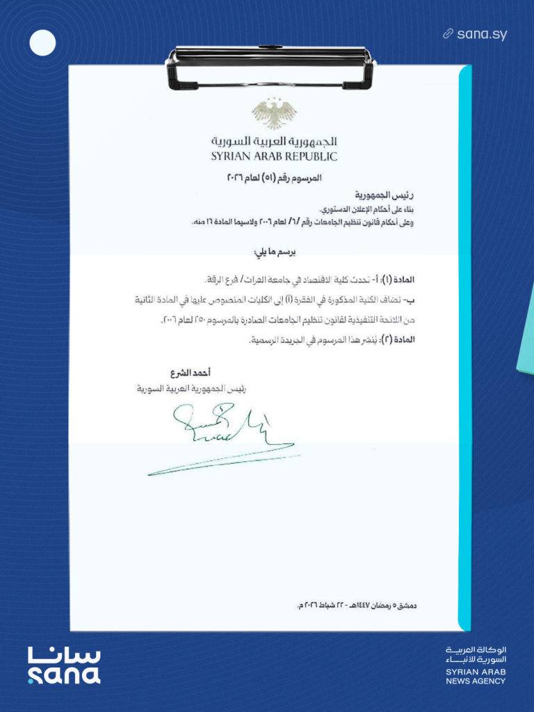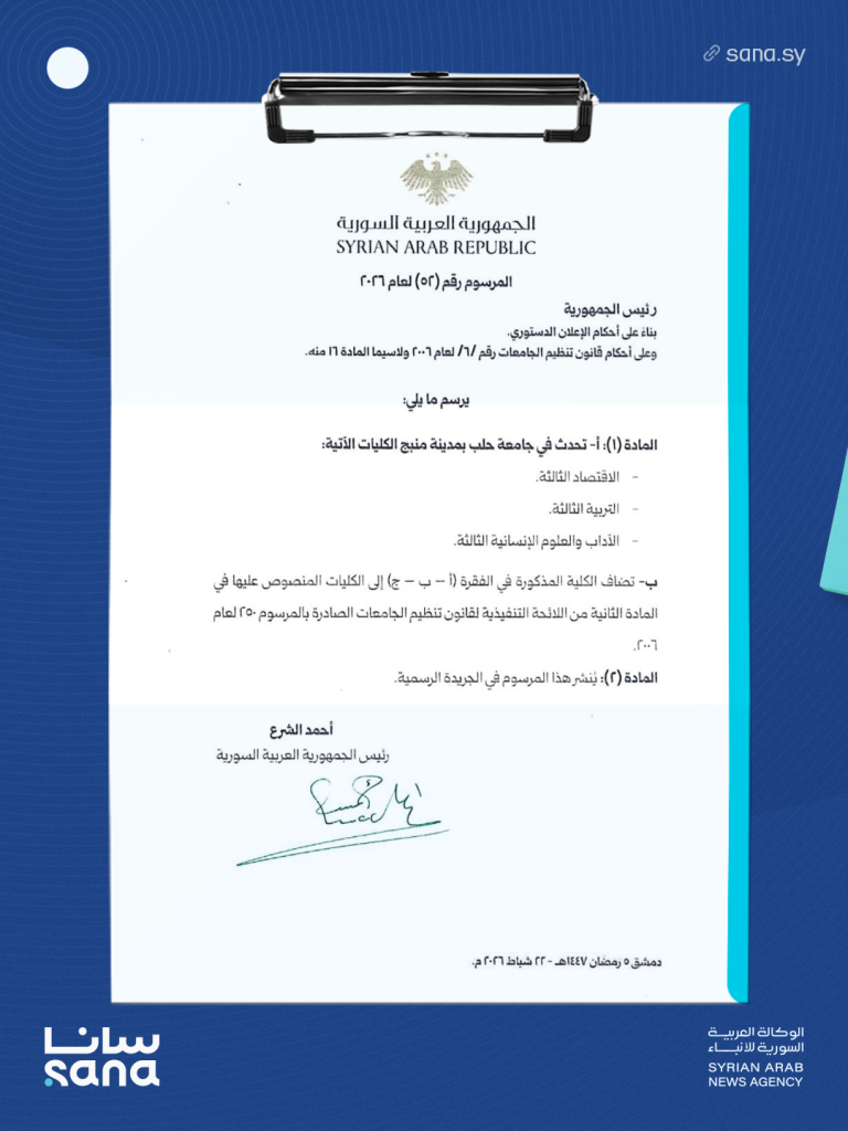 ووفق وكالة الأنباء السورية الرسمية "سانا"، أصدر الشرع المرسوم رقم 52 لعام 2026 القاضي بإحداث كليات: الاقتصاد الثالثة، التربية الثالثة، الآداب والعلوم الإنسانية الثالثة، في جامعة حلب بمدينة منبج. كما وأصدر المرسومين 50 و51 لعام 2026، القاضيين بإحداث كلية الحقوق، وكلية الاقتصاد في جامعة الفرات – فرع الرقة.