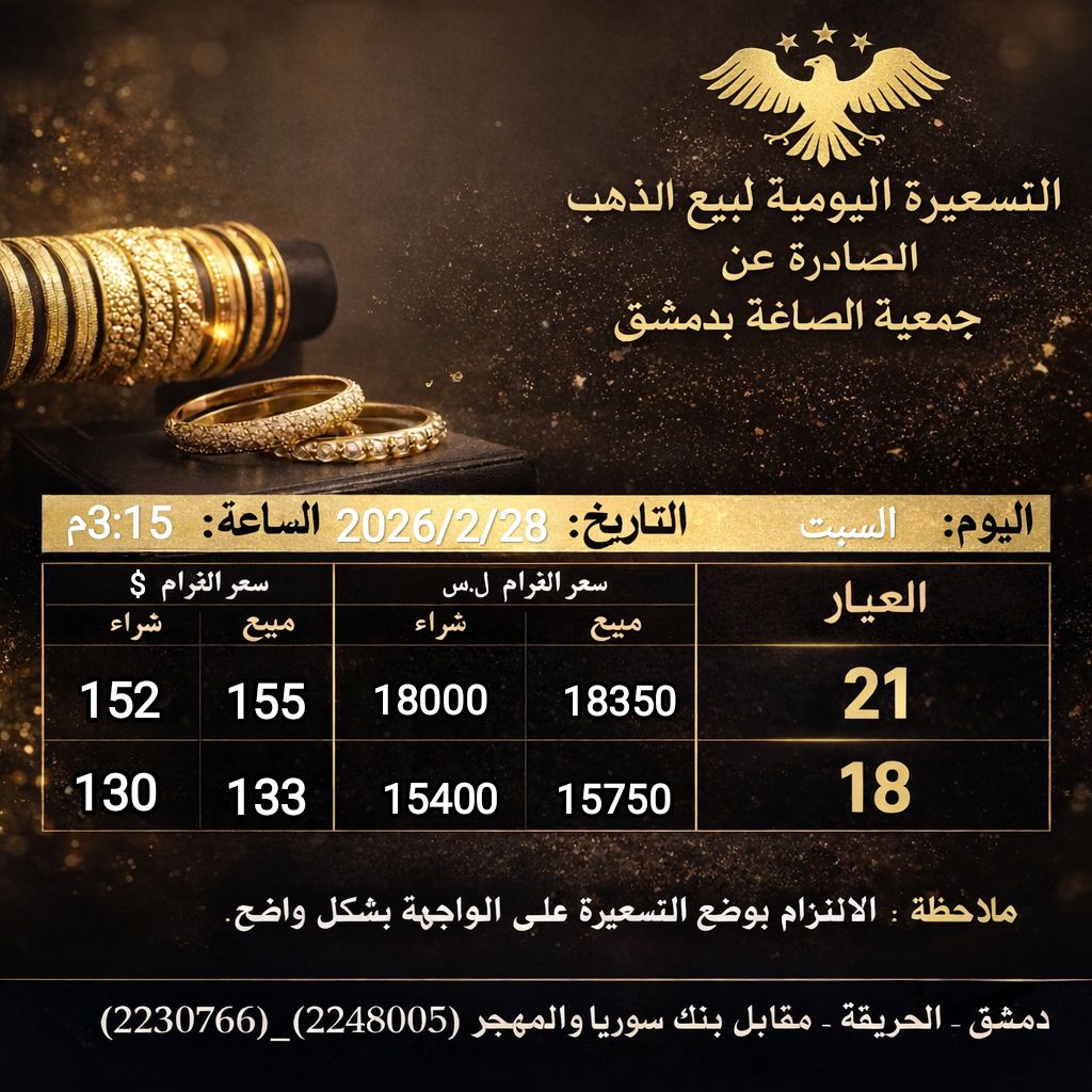 وفي الـ 11:40 صباحاً، أصدرت جمعية الصاغة في دمشق أول تسعيرة رسمية لليوم السبت، لترفع مبيع غرام الـ 21 ذهب 400 ليرة جديدة (40 ألف ليرة قديمة)، مقارنة بالسعر الصادر ظهيرة أمس الأول الخميس. وقدّرت الجمعية "دولار الذهب" بنحو 117.45 ليرة جديدة (11745 ليرة قديمة).