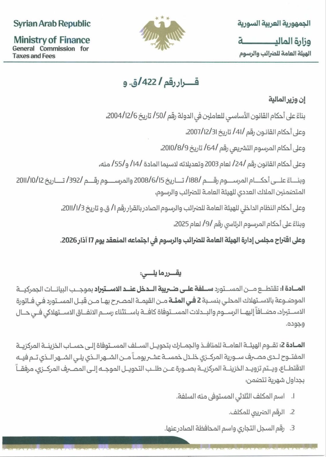 أصدرت وزارة المالية قراراً يستوجب استيفاء سلفة ضريبية من المستوردين، بنسبة 2% من قيمة الفاتورة. كما وأصدرت قراراً آخر يتم من خلاله إلزام المستورد بالحصول المسبق على براءة ذمة مالية، مع تقديم فترة سماح للتسهيل على المستوردين ومنعاً لتعطيل أعمالهم.
