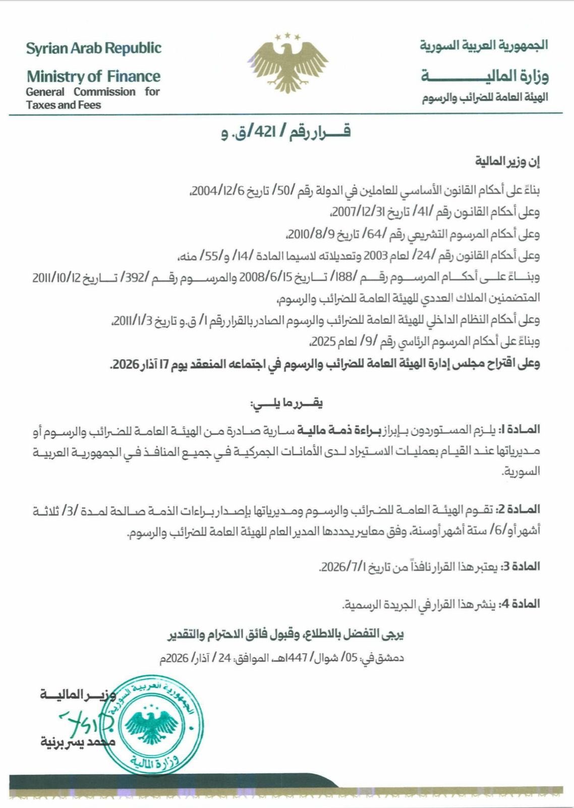 قراران يلزمان المستوردين بسلفة ضريبية وبراءة ذمة مالية