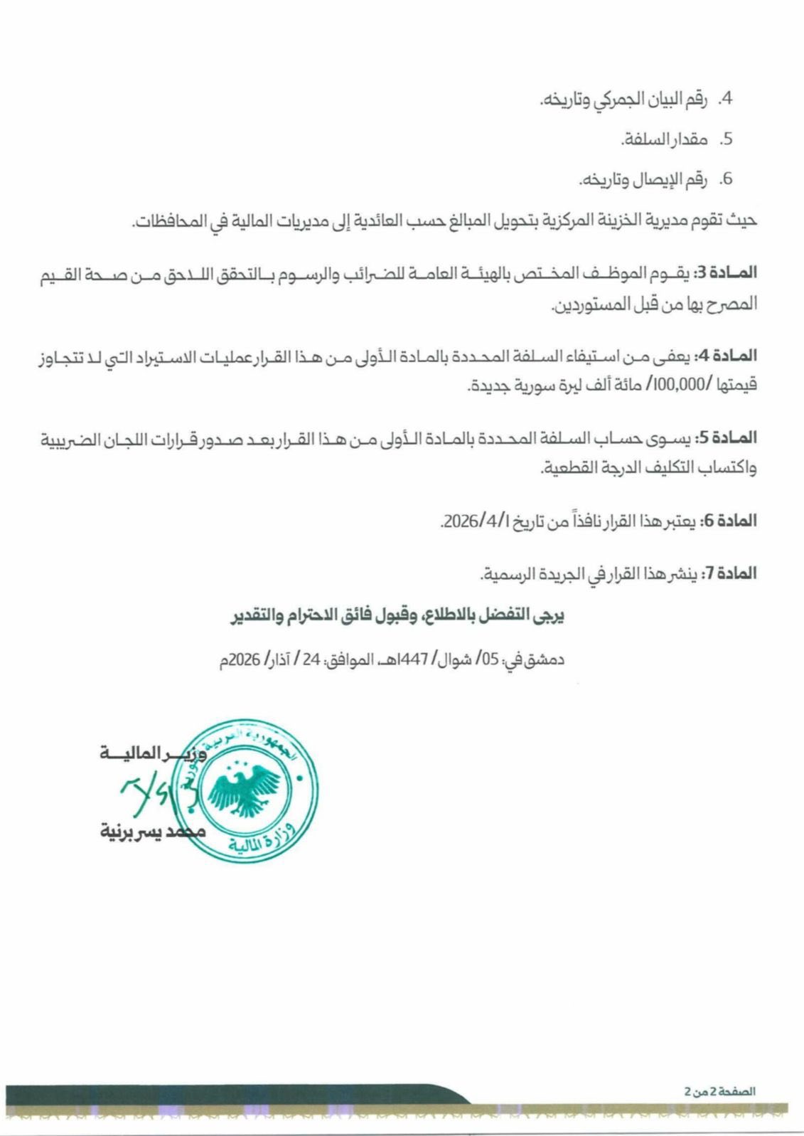 -السلفة غير مطلوبة عن عمليات الاستيراد التي تقل قيمتها عن 100 ألف ليرة سورية جديدة.