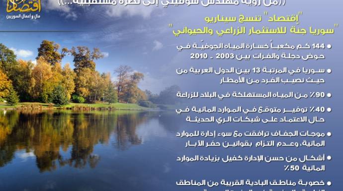 أشكال من حسن إدارة الموارد المائية من هذا القبيل الذي أوردناه آنفاً كفيل بزيادة الموارد المائية في سوريا ربما بنسب تتجاوز بكثير 50%، وترفع من قدرات أية حكومة سورية مستقبلية على إدارة مشروع استثماري عملاق لتحويل سوريا إلى جنّة للاستثمار الزراعي والحيواني.