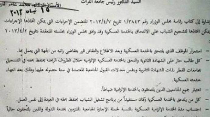 الكتاب المؤرخ في 11 نيسان /أبريل2013، أوضح أن الحكومة قررت اعتبار كل الجامعيين الذين يلتحقون بالخدمة العسكرية ضباطاً، لكنه لم يوضح ما المقصود بكلمة الجامعيين، وهل هم من أنهوا الجامعة أم من دخلوها حتى ولو كانوا في السنة أو الأشهر الأولى؟