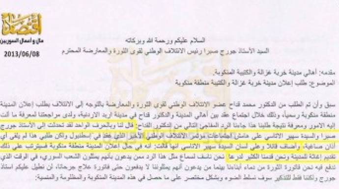 وكانت "اقتصاد" قد حصلت على صفحة أولى من رسالة وجّهها أهالي مدينة خربة غزالة والكتيبة في محافظة درعا إلى جورج صبره، رئيس الإئتلاف الوطني .
