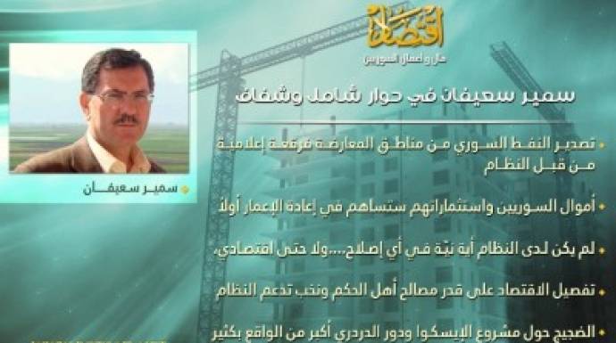 أجرت "اقتصاد" حواراً شاملاً مع الاقتصادي السوري، سمير سعيفان، حول جملة من الأمور المتعلقة بالشأن الاقتصادي السوري الراهن والمستقبلي، تمحورت حول قضايا عدة أبرزها: سيناريوهات إعادة الإعمار ومصير استقلالية القرار الوطني فيها، ودور رأس المال السوري المحلي والمغترب في هذه السيناريوهات، إلى جانب ما يتعلق بالحديث الإعلامي المتواتر عن مبادرة "الدردري "لإعادة الإعمار في سوريا وعلاقته مع النظام السوري، وخلفيات حديث مسؤولي النظام عن "مرحلة ما بعد الأزمة".