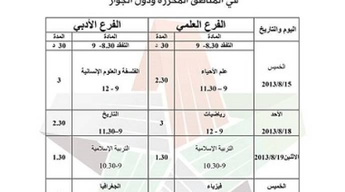 وتمتد الامتحانات بين 15 و29/8/ 2013، وسيخضع طلاب الفرع العلمي فيها لامتحان في 7 مقررات، تبدأ بـ"علم الأحياء"، وتنتهي بـ"الكيمياء".