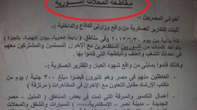 أنه بداية من يوم 30/6/2013 وفي مناطق (رابعة العدوية- ميدان النهضة- الجيزة) يتواجد المئات من السوريين المتظاهرين مع الإخوان المسلمين والمشتركين معهم في أحداث الشغب والعنف والبلطجة التي قاموا بها.