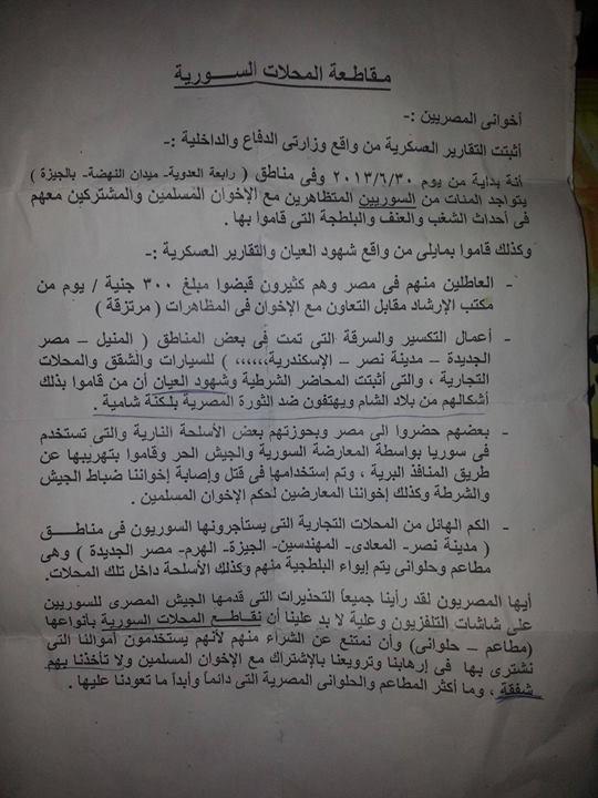 "بعد القبض علي سوري أمس يطلق النار على المصريين وورود أنباء عن وجود سوريين في رابعة-إشارة إلى مكان اعتصام الإخوان بمدينة نصر- ندعو إلى مقاطعة محلات السوريين في الرحاب حتى يحترموا البلد التي احتموا بها".