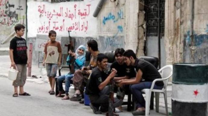صورة لطفلة تحمل كلاشينكوف بين يديها، بجانبها مقاتل من الجيش الحر، في أحد أحياء حلب.