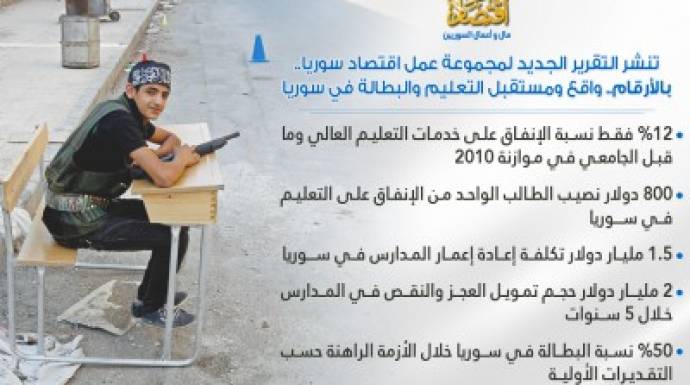 وتنشر "اقتصاد" التقرير الأخير حول التعليم واليد العاملة، لتعريف القارئ السوري بأبرز ملامح قطاع التعليم وواقع البطالة في سوريا، قبل الثورة، وأبرز الأضرار التي طالت هذين القطاعين، خلال الحرب والنزاع المسلح في البلاد، ومن ثم جملة النصائح والتوجيهات حول كيفية التعامل مع هذين القطاعين في مرحلة ما بعد الثورة وإعادة الإعمار في البلاد.