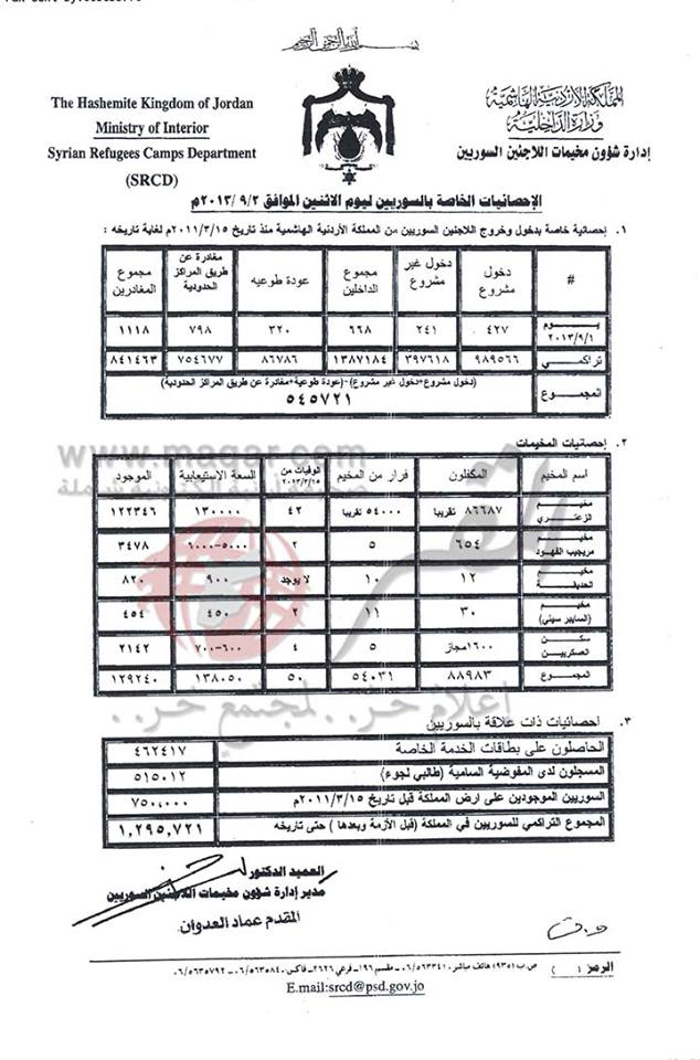 وجاء في إحصائيات الوثيقة أن عدد السوريين الذين دخلوا الأردن بشكل مشروع بلغ يوم 1سبتمبر / ايلول الجاري ، 427 والعدد التراكمي 189566، أما الداخلون بشكل غير مشروع فبلغ عددهم 241 والعدد التراكمي 297618 أما عدد الذين عادوا إلى سوريا طواعية فبلغ 1387184 وتتضمن الوثيقة إحصائيات حول عدد اللاجئين السوريين في مخيمات اللجوء الأردنية من حيث أعدادهم وأعداد المكفلين منهم والوفيات والسعة الاستيعابية، ففي مخيم الزعتري بلغ عدد اللاجئين 122346 منهم 86687 مكفلاً تقريباً، وبلغ عدد الفارين من الزعتري 4000 لاجئ وعدد الوفيات 42 فيما بلغت السعة الاستيعابية لهذا المخيم 130000 وفي مخيم "مريجيب الفهود" بلغ عدد اللاجئين القاطنين فيه 3478 عدد المكفلين منهم 654 وبلغ عدد الفارين 5 لاجئين والوفيات شخصين والسعة الاستيعابية للمخيم بلغت 4000- 5000 وفي مخيم الحدائق الملكية بلغ عدد اللاجئين 820 عدد المكفلين منهم 12 لاجئا وعدد الفارين من المخيم 10 أشخاص ولم تسجل حالات وفاة في المخيم وبلغت السعة الاستيعابية للمخيم 900 شخص.
