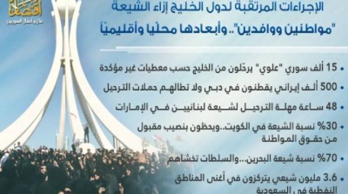 وكانت مدونات الكترونية موالية للنظام قد ألمحت إلى طرد أكثر من 15 ألف سوري من "العلويين"، وعشرات اللبنانيين الشيعة، وبعض المسيحيين، من دول الخليج، إلى جانب تهديد أكثر من نصف مليون لبناني باحتمال الترحيل. ولا يمكن الجزم بصحة هذه الأرقام، إلا أن حالات الترحيل الواسعة التي استهدفت شيعة لبنانيين مقيميين في دول الخليج، باتت مؤكدة في تقارير إعلامية غربية.