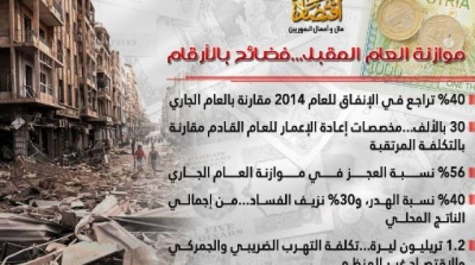 وافقت حكومة النظام منذ أيام على مشروع موازنة العام 2014، والمُقدّرة بـ 1.39 تريليون ليرة سورية، بزيادة تُقدّر بسبعة مليارات ليرة على موازنة العام الجاري 2013 التي بلغت 1.32 تريليون ليرة سورية، حسب وكالة أنباء النظام "سانا".