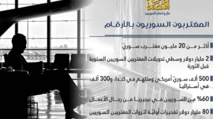 وتذهب بعض الأرقام غير المؤكدة إلى أن ثروات المغتربين السوريين الذين ما يزالون يحافظون على ارتباطهم بهويتهم السورية تقُدّر بحوالي 80 مليار دولار، إلا أن بعض الاقتصاديين يرفضون هذه الأرقام بحكم أن الطريقة التي تم استنتاجها بواسطتها لا تتمتّع بالمنهجية العلمية.