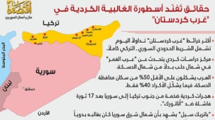 ومن ثم لدينا دراسة "التوزع السكاني في محافظة الحسكة السورية"، الصادرة عن مكتب دراسات "التجمع الوطني للشباب العربي"، منذ قرابة العام، والتي خلصت إلى أن 30% فقط هي نسبة الأكراد في الحسكة وريفها، وأن 62% نسبة القرى العربية في منطقة القامشلي، وأن نسبة القرى ذات الغالبية الكردية في كامل محافظة الحسكة لا تتجاوز 26%.