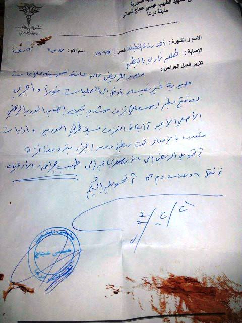 ويضيف: تم التنسيق لنقل الجريح إلى مشفى إربد التخصصي كما تم تجهيز غرفة العمليات وطبيب الأوعية لإجراء عمل جراحي إسعافي وسريع، وبعد ساعتين من الانتظار وصل الجريح إلى مشفى الرمثا، وهو موضوع على جهاز "الأمبو" للتنفس اصطناعي، دون وجود علامات حيوية سيئة جداً: نبض غير مجسوس وضغط متدني، وتم إدخال الجريح لغرفة الإسعاف في مشفى "إربد" التخصصي ولكن المشفى المذكور رفض استقبال الحالة عند علمهم بأن الجريح على جهاز التنفس الاصطناعي، وتم استدعاء طبيب مشفى الرمثا المناوب في قسم الاسعاف من أجل تحويل الجريح إلى مشفى الملك عبدالله المؤسس، وذلك بناء على التعليمات التي تنص على عدم تحويل أي جريح يصل مشفى الرمثا إلى أي مشفى آخر إلا بموافقة الطبيب الأردني المناوب.