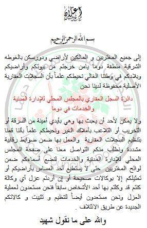 وفي إعلان مهم، اطلعت "اقتصاد" على نسخة منه، شددت الدائرة أن السجلات العقارية لساكني منطقة دوما "لايمكن لأحد أن يعبث بها، وهي في أيد أمينة من السرقة أو التخريب أو التلاعب".