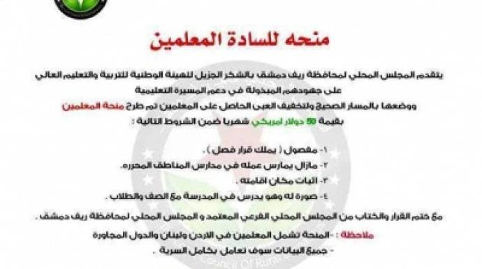 أعلن المجلس المحلي لمحافظة ريف دمشق عن منحة شهرية للمعلمين السوريين، خصصتها الهيئة الوطنية للتربية والتعليم العالي.