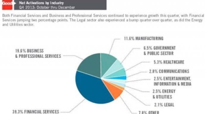 شكلت الأجهزة العاملة على iOS نسبة 73% من مجمل الأجهزة التي تم تفعيلها في قطاع المؤسسات فيما لم تحصل الأجهزة العاملة على النظام الشهير الآخر أندرويد على أكثر من 26 % والنظام ويندوز فون على 1 % فقط في المرتبة الثالثة.