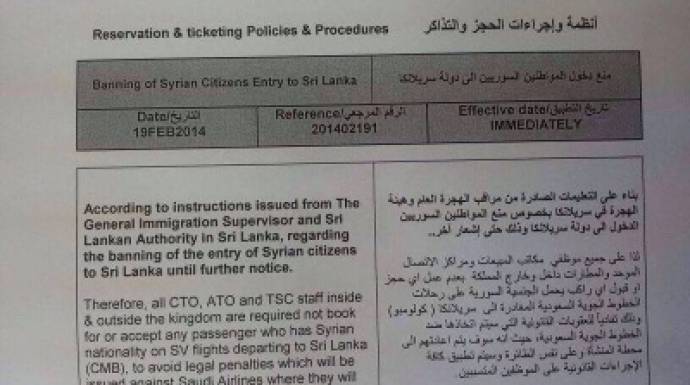 وحذّر القرار جميع موظفي مكاتب المبيعات ومراكز الاتصال الموحد والمطارات داخل وخارج المملكة بعدم عمل أي حجز أو قبول أي راكب يحمل الجنسية السورية على رحلات الخطوط الجوية السعودية المغادرة إلى سيرلنكا (كولومبو)، وذلك تفادياً للعقوبات القانونية التي سيتم اتخاذها ضد الخطوط الجوية السعودية حيث إنه سيتم إعادتهم إلى محطة المنشأة وعلى الطائرة نفسها وسيتم تطبيق كافة الإجراءات القانونية على الموظفين المتسببين).
