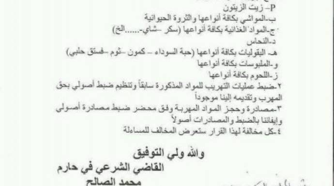 القرار الذي اطلعت "اقتصاد" على نسخة منه، نص على ضبط المهربين وتنظيم ضبوط بحقهم وإحضارهم موجودين للمحكمة الشرعية، إضافة إلى حجز المواد المهربة ومصادرتها.