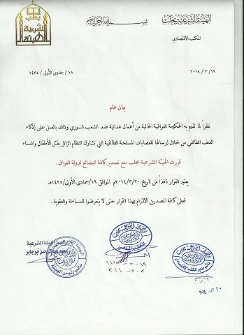 أصدرت الهيئة الشرعية بحلب بياناً وصفته بـ "الهام" منعت بموجبه الصناعيين تصدير كافة البضائع لدولة العراق.