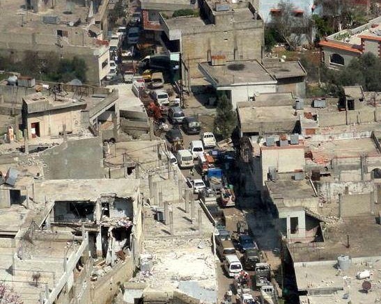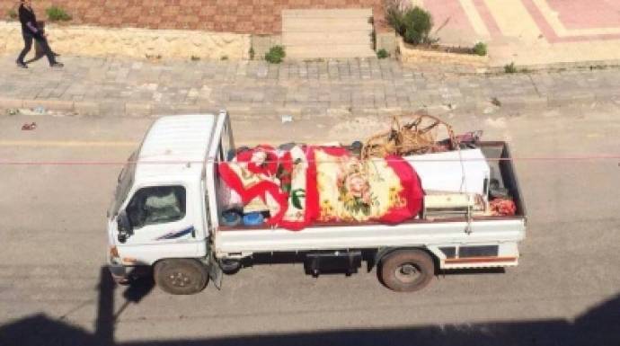 وبث ناشطون شريط فيديو لسيارات ودراجات نارية تحمل أدوات وحاجيات منزلية، وتسير بسرعة في رتل طويل وسط أصوات إطلاق الرصاص وتبدو شاحنة صغيرة "سوزوكي" خلف الرتل تحمل العديد من الشبيحة والأطفال ترافقها كاميرا وسط طريق طويل تتوزع على جانبيه بيوت مهدمة وأخرى تم حرقها بعد أن نهبت محتوياتها والكثير من هذه البيوت تبدو خالية من السكان. ووسط هذا المشهد (المخزي) يصرخ أحد الشبيحة (رايتنا راح تظل مرفوعة)، فيما بدت على رصيفي الطريق أدوات منزلية أخرجت من البيوت بغرض نهبها، ومنها خزائن وأفران غاز وبرادات وغسالات، وبالقرب منها يقف شبيحة أمام صناديق سياراتهم الخلفية ويقومون بتعبئتها بأغراض منزلية صغيرة، وبعد قليل يظهر صوت لأحد الشبيحة (هون المقاومة كلها صارت)، وهي شهادة بأن مليشيا حزب الله حالش شاركت في عمليات "التعفيش" كما فعلت في حمص ويبرود.