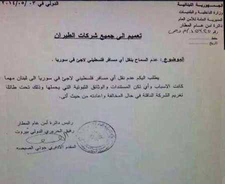 وجاء في نص الخطاب الذي وجهته سلطات المطارات اللبنانية إلى شركات الطيران تحت عنوان "عدم السماح بنقل أي مسافر فلسطيني لاجئ في سوريا"، أن الشركة التي تنقل لاجئين فلسطينيين إلى لبنان تواجه عقوبة التغريم المالي لها.