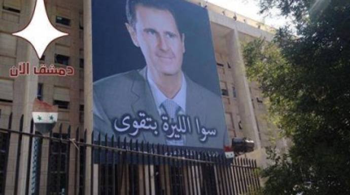 بابتسامة عريضة، وإطلالة "مهيبة"، ترتفع لوحة ضخمة للغاية، على باب مصرف سوريا المركزي، تحمل صورة "بشار الأسد"، وفي أسفلها عبارة "سوا الليرة بتقوى"، في اقتباسٍ من شعار حملة الأسد "سوا".