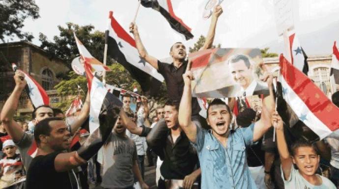 وكتب على صور بشار الأسد الذي ستكرس الانتخابات الرئاسية المقررة في الثالث من حزيران/يونيو داخل سوريا بقاءه في السلطة، عبارات إشادة بينها "تاج الوطن" و"اسد العرب" و"بالدم بالروح، نفديك يا بشار".