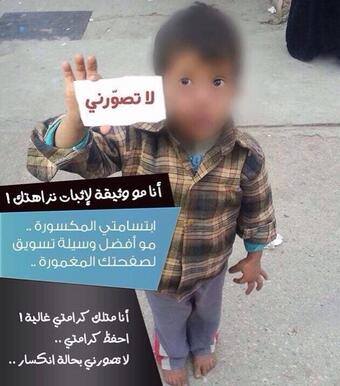 "لا تصورني أنا لست وثيقة لإثبات نزاهتك، ابتسامتي المكسورة ليست أفضل تسويق لصفحتك المغمورة، أنا مثلك كرامتي غالية، أحفظ كرامتي لا تصورني بحالة انكسار"، كلمات بليغة جعلها عدد من ناشطي "فيسبوك" شعاراً لحملة ضد ظاهرة سلبية تمثلت في قيام الكثير من الجمعيات الخيرية وهيئات إغاثة اللاجئين السوريين وبعض الأفراد في دول اللجوء بتصوير العائلات والنساء والأطفال منهم بالذات أثناء توزيع الإعانات والمساعدات التي يقدمونها لهم ونشرها على صفحات "فيسبوك" ومواقع التواصل الاجتماعي، بغرض التفاخر حيناً، والتوثيق أحياناً أخرى، وربما لاستجرار التبرعات والمساعدات وسرقة المال الإغاثي في أحايين أخرى، وأياً يكن الهدف من تصوير اللاجئين ونشر صورهم، فإن هذه الظاهرة مرفوضة بكل المعايير وهي تعد اعتداءً صارخاً على حرمة اللاجئين وكرامتهم واستغلال لحاجتهم والظروف التي أجبرتهم على اللجوء، وتتطلب من الناشطين محاربتها وكشف من يقوم بها لأن الشعب السوري لم يكن يوماً مدعاة للشفقة أو التسول باسمه وكرامة السوريين لا تدانيها كرامة أخرى في العالم.