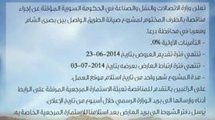 أعلنت وزارة الاتصالات والنقل والصناعة في الحكومة المؤقتة عن مناقصة لصيانة إحدى الطرق في محافظة درعا.